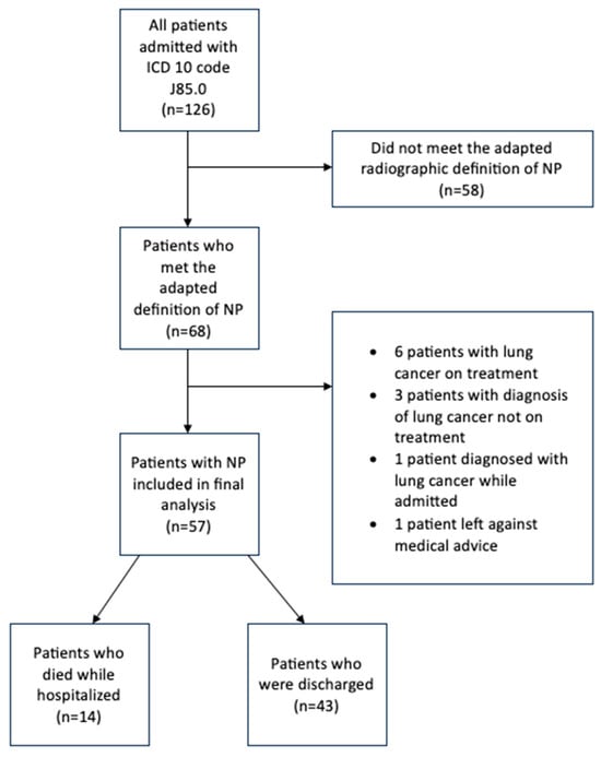 Patients were included if they were hospitalized with an ICD 10 code J85.0, were at least 18 years of age or older, and met the above-described definition for NP. Patients were excluded in the event they were diagnosed with lung cancer but not started on treatment or were currently being treated for lung cancer.