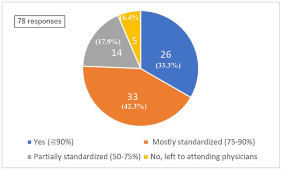 In 33.3% of institutions, more than 90% of the postoperative management and prevention as well as treatment of CVS was determined by standardized protocols, with less than 10% left to the discretion of the attending physician. Furthermore, 42.3% of institutions conducted treatment primarily (75–90%) in accordance with established protocols, allowing 10–25% of treatment to be made at the physician’s discretion. In 17.9% of institutions, treatment was guided by protocols in more than half (50–75%) of treatments, with 25–50% left to the attending physicians’ judgment. In 6.4% of institutions, management was entirely at the discretion of the attending physician (Figure 1).