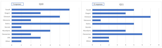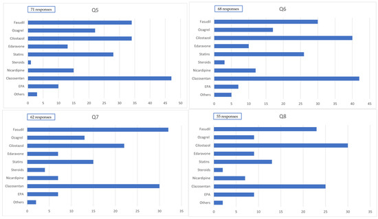 Among patients with severe conditions who underwent endovascular surgery, the predominantly used drugs (>80% of cases, reported across 11 responses) were clazosentan in 6 cases (54.5%), cilostazol in 7 cases (63.6%), fasudil hydrochloride in 5 cases (45.5%), statins in 5 cases (45.5%), nicardipine (for purposes other than blood pressure control) in4 cases (36.4%), edaravone in 1 case (9.1%), and EPA preparations in 2 cases (18.2%) (Figure 3).