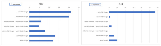 Method of cerebrospinal fluid drainage. Q13. Method of cerebrospinal fluid drainage used postcraniotomy. Q14. Method of cerebrospinal fluid drainage used postendovascular treatment.