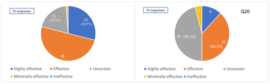 Impression of the efficacy of clazosentan. Q19. Clinical impression of the effectiveness of clazosentan for preventing cerebral vasospasm. Q20. Clinical impression of the effectiveness of clazosentan for improving outcomes.