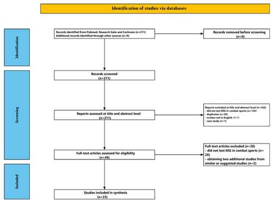 Figure 1 shows the flow of the screening process. The initial database search yielded 211 studies. After reviewing the titles and abstracts, 162 papers were excluded—130 for being unrelated to EEG in combat sports, 30 as duplicates, 1 for being written in a language other than English, and 1 for being a case study. The remaining 49 articles underwent full-text review, during which 28 were excluded for not directly addressing EEG in combat sport contexts. Two additional relevant studies were identified through PubMed’s related articles function. In total, 23 studies met all inclusion criteria and were selected for the final analysis.