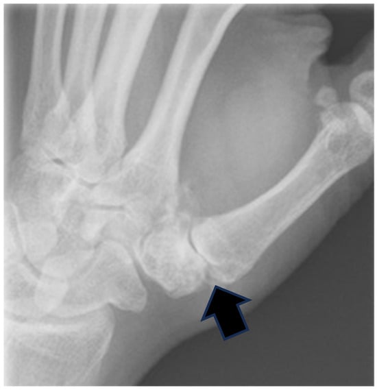 Outcome assessments were performed using standardized protocols. Each patient underwent a comprehensive clinical evaluation preoperatively and at 24 months postoperatively. Pain was evaluated using a 10-point Visual Analog Scale (VAS), a validated tool for quantifying the subjective experience of pain [8,9]. The thumb’s range of motion (ROM) was measured using a standard goniometer, following American Society of Hand Therapists guidelines, which provides a reliable assessment essential for tracking functional changes [10]. Key pinch strength was assessed using a Jamar dynamometer (Therapeutic Equipment, Clifton, NJ, USA) according to the standardized protocols, with measurements recorded as a percentage of the contralateral side. This metric is particularly relevant, as a decreased key pinch strength correlates strongly with the severity of carpometacarpal osteoarthritis and overall hand functionality [11,12]. Standard anteroposterior and lateral radiographs were obtained at each follow-up to evaluate joint stability and potential subluxation or collapse (Figure 7). Basal joint space width was measured on radiographs immediately postoperatively and at 24 months to quantify joint collapse. All complications were systematically documented throughout the follow-up period. These assessment methods ensured consistent and reliable outcome measurements across all the study participants, aligning with established guidelines for evaluating hand surgery outcomes [13].