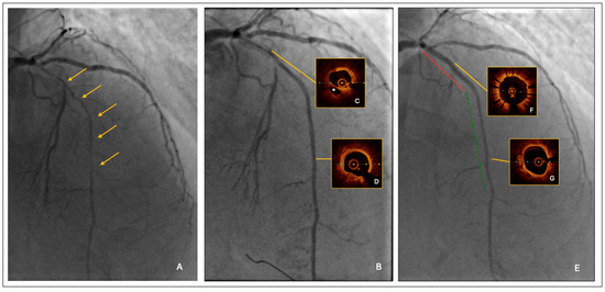(A) Long severe critical stenosis of LAD. The orange arrows indicate the long segment of severe critical stenosis of LAD. (B) Angiographic result after lesion predilatation by semi-compliant balloons. (C) Pre-PCI OCT: Proximal linear dissection. The * indicates the false lumen of the proximal LAD linear dissection. (D) Pre-PCI OCT: Adequate distal luminal gain. (E) Angiographic result after PCI with DES (red line) and DEB (green line). (F) Post-PCI OCT: Optimal DES apposition. (G) Post-PCI OCT: Good distal luminal gain after DEB.