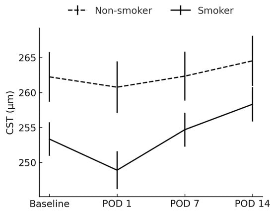 CST was significantly lower in smokers preoperatively (mean difference −9 µm, p = 0.041) and on POD 1 (mean difference −8 µm, p = 0.044), but not at later follow-ups (Figure 1).