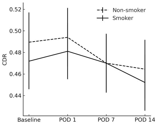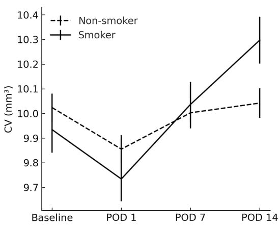 CV had become significantly higher in smokers by POD 14 (10.30 ± 0.60 mm3 vs. 10.04 ± 0.38 mm3; p = 0.026) (Figure 2). Post hoc inspection of mean CST and CV trajectories revealed that the inter-group difference first reached statistical significance between POD 7 and POD 14, indicating a ≈1-week “window of vulnerability” during which smoking-related inflammatory amplification is most pronounced.