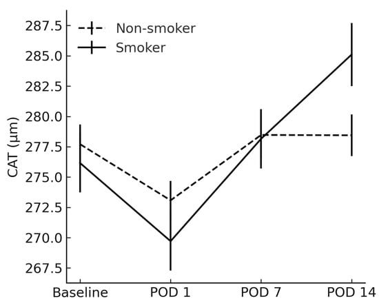 Similarly, CAT in smokers exceeded that in non-smokers on POD 14 (285.1 ± 16.5 µm vs. 278.5 ± 10.9 µm; p = 0.037) (Figure 3).