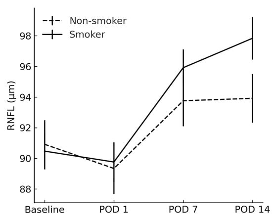Comparison of retinal nerve fiber layer between smokers and non-smokers. RNFL = retinal nerve fiber layer; POD = postoperative day.
