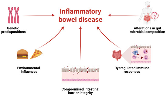 Inflammatory bowel disease (IBD) is divided into Crohn’s disease and ulcerative colitis—two distinct, variable, and disabling conditions characterized by chronic inflammation, recurrent flare-ups, and a wide range of debilitating symptoms. IBD can be defined as a non-infectious, chronic, and immune-mediated inflammatory disorder that predominantly targets the digestive tract [1,2]. This condition significantly impairs patients’ quality of life due to the corresponding immune dysregulation and sustained inflammatory dysfunction [3]. Several risk factors may contribute to the development of IBD, although none are definitive predictors [4,5].