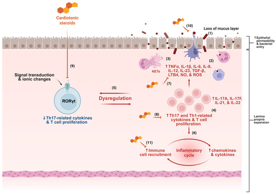 Several mechanisms contribute to the pathogenesis of inflammatory bowel disease (IBD), including disruption of the mucus layer, dysbiosis, and increased epithelial permeability, facilitating bacterial translocation (1). This process triggers immune system activation, characterized by intense cellular infiltration, particularly of neutrophils and monocytes (2), accompanied by the release of various inflammatory mediators and neutrophil extracellular traps (NETs) (3). The presence of T cells with Th1 and Th17 profiles is a hallmark of IBD (4), contributing to the dysregulation of gut homeostasis (5). The inflammatory cycle is perpetuated by continuous cell migration and sustained release of cytokines and chemokines (6). Based on the mechanisms described in the literature, cardiotonic steroids may interfere at multiple points in this inflammatory cascade, including by reducing cytokine production (7), modulating T cell activity (8), dampening Th17 responses (9), preserving epithelial barrier integrity (10), and inhibiting immune cell migration (11). ↑ indicates increase, ↓ indicates decrease, and ⊣ indicates inhibition.