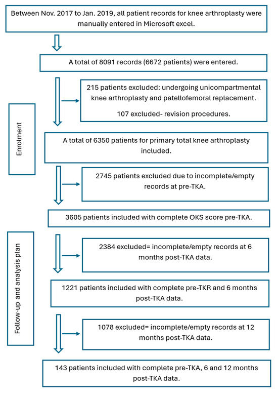 After gaining ethical approval from the ethical committee in the NHS Health Research Authority (18/HRA/0168) and Salford University (HSR1617-137) a retrospective analysis was conducted for all patients undergoing primary TKA at Stepping Hill Hospital. The study was registered on ClinicalTrials.gov (NCT03132077). Participants were included in the analysis if they were scheduled for a primary unilateral total knee arthroplasty (TKA) due to end-stage knee osteoarthritis (Kellgren–Lawrence grade III and IV) and had a stable, well-managed medical condition. Eligibility was determined based on the availability of clinical records that met specific criteria: at least one preoperative assessment conducted within six months prior to surgery, available postoperative data at both six and twelve months after the procedure, and no more than two missing items in the questionnaire (Figure 1). When there were one or two missing scores, the missing values were filled by the mean value of all the remaining responses.
