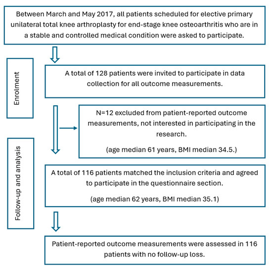 Due to the absence of available retrospective data, this study was conducted as a prospective cohort study to evaluate six- and twelve-month outcomes following primary total knee arthroplasty (TKA) in King Khalid University Hospital. Ethical approval was gained from the Ethical committee of Salford University (HSR1617-39) and the King Khalid University Hospital (E-17-2395). Additionally, the study was registered on ClinicalTrials.gov (NCT02998125). Patients with stable and well-controlled medical conditions who were scheduled for elective primary unilateral TKA due to advanced knee osteoarthritis (Kellgren–Lawrence grade III and IV) were asked to take part in the study (Figure 2).