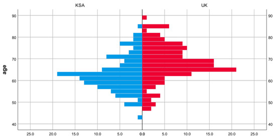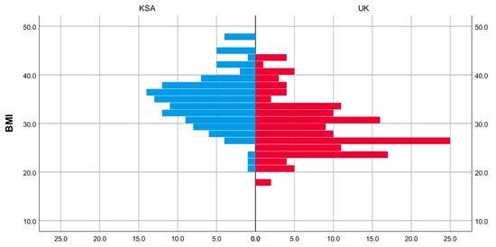 The age distribution and BMI appeared to be almost similar between the group, as determined through visual inspection (Figure 3 and Figure 4). The medians for age and BMI were statistically significantly different; patient age was 5 years lower in the KSA cohort compared the UK cohort. Meanwhile, patient BMI was 7 points lower in the UK cohort compared to the KSA cohort (Table 1). A chi-square test revealed a significant difference in gender proportion between the two groups, p = 0.001. There was a higher proportion of males in the UK group than in the KSA group (37% vs. 17%) (Table 2).