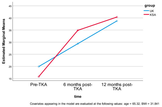A multiple comparisons analysis was conducted to identify where significant differences occurred over time following TKA (pre, and six and twelve months post-TKA) and between groups (UK, KSA). At baseline, the UK cohort had a significantly higher OKS (19 ± 6) compared to the KSA cohort (15 ± 4), reflecting a 4-point difference. At six months post-TKA, the KSA cohort demonstrated a significantly higher OKS (34 ± 3) than the UK cohort (29 ± 5), with a 5-point difference. However, by twelve months postoperatively, the OKS between the UK (38 ± 3) and KSA (40 ± 1) groups revealed no statistically significant difference, with only a 1.8 difference (Table 5 and Figure 5).
