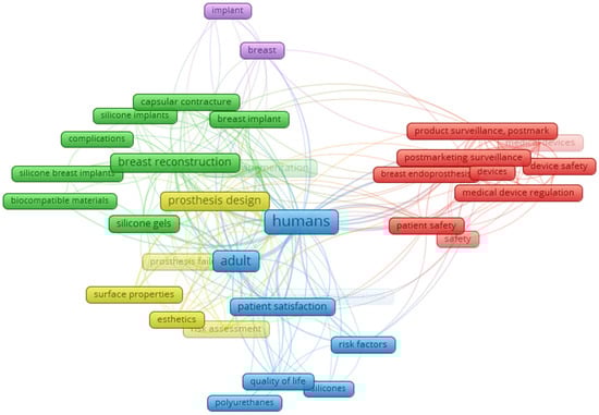 The bibliometric network of recurring terms found in the titles, keywords, and abstracts of these documents, which appeared at least 22 times, was configured with “co-occurrence,” “full count,” and “keywords,” as illustrated in Figure 1. The analysis provides an overview of the most frequent terms, highlighted by larger rectangles. The academic community’s focus encompasses topics such as humans, implants, breasts, biocompatible materials, capsular contracture, prosthesis design, silicone gels, surface properties, aesthetics, patient satisfaction, quality of life, breast implants, postmarketing product surveillance, safety, postmarketing surveillance, silicone, polyurethane, and risk factors, among others.