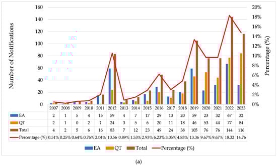 In 2012, there was a substantial increase in notifications of AEs (n = 59) and TCs (n = 24) (Figure 2a), indicating a shift in behavior with intensified surveillance by regulatory authorities, which accounted for 92.8% of the notifications in that year (Figure 2b). This significant increase was likely driven by the scandal involving implants adulterated with industrial silicone by a French manufacturer and successive recalls of breast implants that occurred during that period, highlighting the importance of continuous surveillance in this context [41,42,43]. The publication of resolutions such as RDC No. 16 on 21 March 2012 [44] and RDC No. 33 on 3 May 2012 [45] significantly influenced the regulation of breast implants and prostheses in Brazil by establishing strict quality requirements, addressing previous regulatory gaps. Later, both resolutions were updated by RDC No. 550 on 22 December 2021 [6].