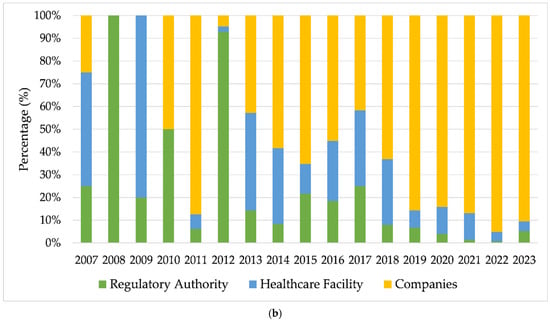(a) Annual evolution of adverse event (AE) and technical complaint (TC) reports related to breast implants (2007–2023); (b) temporal evolution of the proportion of reports made by regulatory bodies, healthcare facilities, and companies. Source: ANVISA. Notivisa. The data were updated on 10/09/2024 and are subject to review.