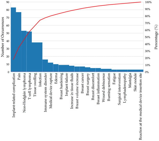 Pareto chart of the occurrence of adverse events associated with breast implants—Brazil, 2007–2023. Source: ANVISA. Notivisa. The data were updated on 10 September 2024 and are subject to review.