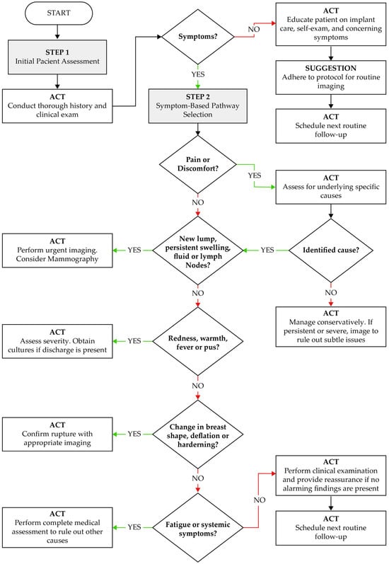 Based on the integrated analysis of technovigilance data and real-world clinical outcomes, we propose a symptom-based clinical decision-making algorithm to support early identification and appropriate management of complications related to breast implants (see Figure 4). This algorithm aims to aid clinicians in systematic evaluation and streamline decisions regarding imaging, patient reassurance, conservative treatment, or further investigation.
