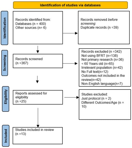 From 400 manuscripts identified through systematic literature search, thirteen met the inclusion criteria and were included in the review, as illustrated by the PRISMA flowchart (Figure 1). The thirteen selected studies included eight RCTs focus on low resistance training [9,19,20,21,22,23,24,25], three RCTs focus on walking training [26,27,28], and two RTCs focusing on functional training [29,30].
