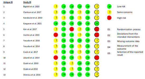 Risk of bias summary for included studies [9,19,20,21,22,23,24,25,26,27,28,29,30].