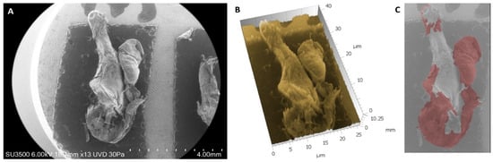 Qualitative evaluation at low magnification of a sample treated with a conventional surgical technique: VP-SEM (A) magnification 13×; (B) 3D reconstruction; (C) the false color image emphasizes the presence of cholesteatoma residues.