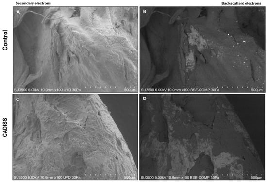 (A,B) The sample was treated with conventional surgical technique (control VP-SEM): (A) magnification 100× secondary electrons and (B) 100× backscattered electrons; the white area is indicative of exposed bone surface. (C,D) The sample was treated with the CADDIS technique (CADISS VP-SEM): (C) magnification 100× secondary electrons and (D) 100× backscattered electrons; the white area is indicative of exposed bone surface. Note the larger area compared with the control sample.