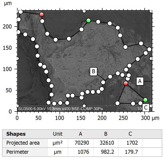 Area measurement results automatically acquired using the Hitachi Mountains Map software on BSE mode images.
