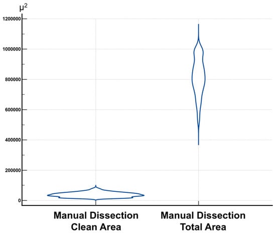 In the manual dissection group, the mean cleaned area was 38,311.18 µm2 (95% CI: 36,671.56–39,950.80), with a standard deviation (SD) of 15,596.25 µm2. The mean total area was 814,325.77 µm2 (95% CI: 801,462.70–827,188.84). The corresponding distributions for these parameters are graphically illustrated in Figure 5, and detailed descriptive statistics are presented in Table 1.