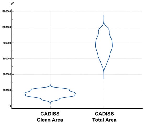 In the CADISS-assisted group, the mean cleaned area was 155,441.69 µm2 (95% CI: 150,898.13–159,985.23), and the mean total area was slightly lower at 768,308.05 µm2 (95% CI: 754,318.31–782,297.80). Distribution plots are provided in Figure 6, and the full dataset is summarized in Table 2.