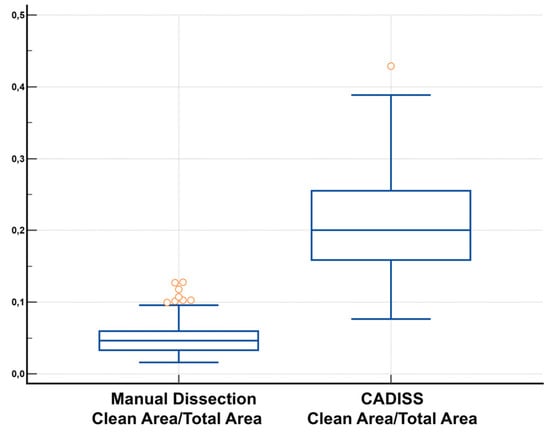 To allow for normalized intergroup comparisons, a clean area/total area ratio was computed for each image. This metric revealed a mean ratio of 0.0478 (SD = 0.0204) in the manual dissection group, with a range from 0.0161 to 0.1277. In contrast, the CADISS group demonstrated a markedly higher mean ratio of 0.2095 (SD = 0.0709), with values ranging from 0.0765 to 0.4284. These distributions are illustrated in Figure 7, while group-specific statistical metrics are presented in Table 3.