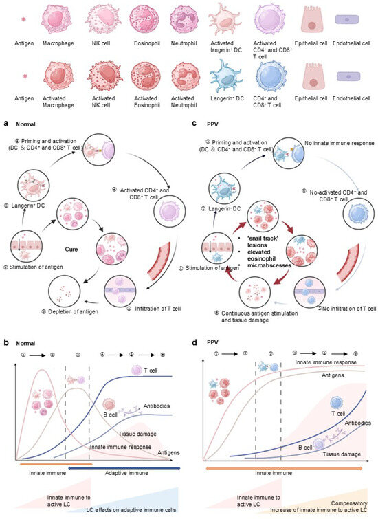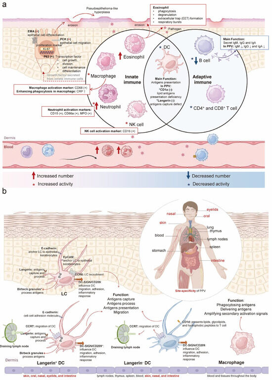 DCs, recognized as the most proficient antigen-presenting cells (APCs) [38], and macrophages, another type of APC, are pivotal in detecting and presenting antigens, in resolving skin inflammation [39] (Figure 2b). The skin hosts two major populations of langerin+ DC: LC in the epidermis and langerin+ DC in the dermis [40]. Langerin+ DC is consistent with the site-specificity observed in PPV. The skin also contains two additional subpopulations of APCs: langerin−DC and macrophage, which share functional similarities with langerin+ DC [41]. However, the systemic distribution of langerin−DC and macrophages, without apparent tissue specificity, suggests the possibility that both epidermal LC and dermal langerin+ DC may play essential roles in PPV pathogenesis.