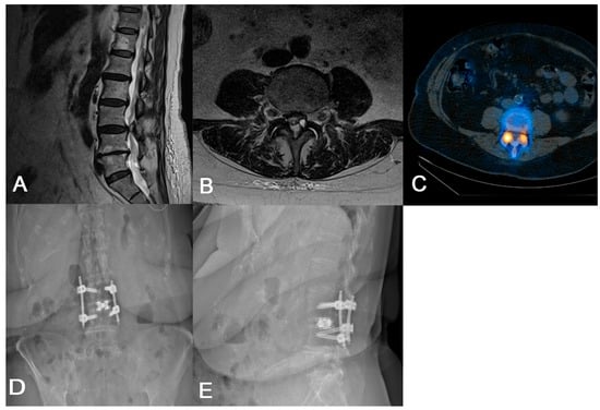 (A) Preoperative sagittal lumbar MRI demonstrating L3/4 spondylolisthesis. (B) Preoperative axial lumbar MRI showing a cyst on the L3/4 facet in addition to nerve root compression. (C) Preoperative axial CT SPECT showing increased radiotracer uptake in the bilateral L3/4 facet joints. (D,E) Postoperative AP and lateral lumbar radiographs demonstrating appropriate implant placement.