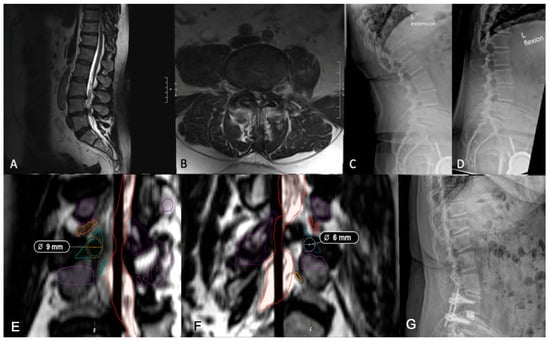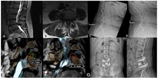 (A,B) Preoperative lumbar MRI demonstrating L4/5 spondylolisthesis. It should be noted that the patient did not complain of a radiculopathy, despite a small-sided left facet cyst at L4/5. (C,D) Preoperative flexion and extension radiographs assessing dynamic instability showing grade I spondylolisthesis at L4/5. (E) Axial imaging showing a right-sided working corridor measuring 9 mm. (F) Left-sided corridor measuring 6 mm, supporting a right-sided approach. (G) Postoperative lumbar radiograph demonstrating appropriate implant placement.