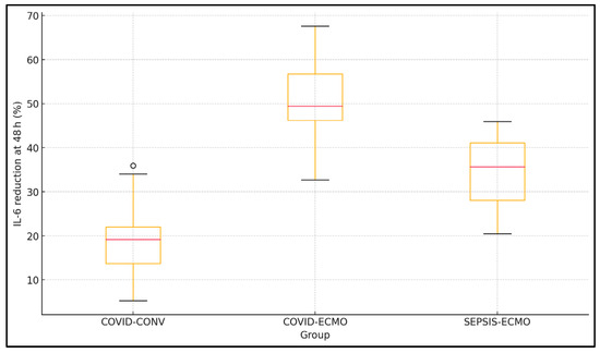 The primary outcome of the study was defined as the change in SOFA score from the baseline index time-point (T0) to 72 h (ΔSOFA0–72). Secondary outcomes included the percentage changes in inflammatory biomarkers (IL-6, CRP, ferritin and D-dimer) at 48 h, changes in mean arterial pressure, vasopressor-free days at 28 days and intensive care unit (ICU) length of stay, as well as all-cause mortality at 28 and 90 days. Major bleeding was assessed according to Extracorporeal Life Support Organization (ELSO) criteria, defined as intracranial bleeding, surgical-site bleeding requiring intervention, or bleeding necessitating transfusion of two or more units of packed red cells within a 24 h period.
