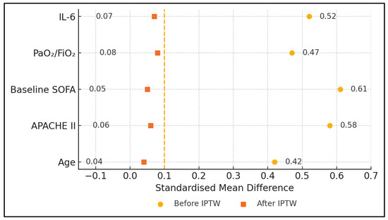 Normality was assessed with Shapiro–Wilk tests. Between-group comparisons used one-way ANOVA or Kruskal–Wallis tests with Dunn–Šidák correction (q-values reported). IPTW based on a multinomial generalised boosted model balanced age, APACHE II, baseline SOFA, PaO2/FiO2 and IL-6; weighted mixed-effects models then estimated group × time interactions. Each horizontal bar depicts the standardised mean difference (SMD) for one covariate before (open marker) and after IPTW (solid marker); values < 0.10 indicate adequate balance.