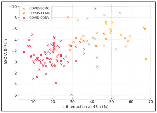Scatter plot of IL-6 reduction vs. ΔSOFA (0 → 72 h).