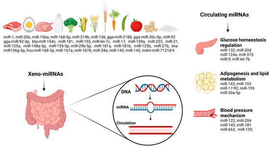 Xeno-miRNAs could enter circulatory systems and organs, where they may influence health and diseases. It was indicated that food intake modifies the inflammatory conditions and redox homeostasis that underline pathological processes in MetS and MetS-related symptoms via delivering xeno-miRNAs. Nonetheless, their absorption, stability, availability, and epigenetic functions are fascinating and debated topics nowadays, but there is scarce information on the physiological and possible adverse consequences of xeno-miRNAs [36]. miRNA-148a in bovine milk appears to encourage β-cell dedifferentiation to the immature mTORC1-high/AMPK-low phenotype, which is characterized by functional deficiencies in insulin production, increased endoplasmic reticulum stress caused by mTORC1, decreased early β-cell apoptosis, and autophagy. Boiling, ultra-heat treatment, and bacterial fermentation deactivate milk’s miRNAs. This raises the suspicion that the continuous consumption of pasteurized milk may cause diabetes via miR-148a [63]. Similarly, milk-derived miR-21 disrupts the homeostasis of α-synuclein, leading to its overexpression and aggregation. This can have harmful consequences on pancreatic β-cells, perhaps contributing to the pathophysiology of T2DM [36]. miRNAs are a significant component of breast milk. The presence of stem cells and breast milk exosome-derived miRNAs is responsible for the highest concentration of miRNAs in breast milk. Second, breast milk miRNAs are extremely resilient to extreme circumstances like UV light, RNase digestion, low pH, high temperatures, repeated freeze/thaw cycles and pasteurization. Thirdly, only a minor portion of miRNA comes from the circulation of maternal blood; the majority comes from mammary epithelial cells. As a result, a variety of organ-derived miRNAs, including pancreatic, liver and hematopoietic-derived miRNAs, are given to breastfed infants. Additionally, xeno-miRNAs have been discovered in breast milk, proving that miRNAs are not just produced endogenously (by the lactation glands or by the mother’s blood circulation) [142]. Some miRNAs abundant in breast milk are essential for immune system-related pathways: miR-155 regulates the maturation of T and B cells and the innate immune response, miR-92s are responsible for T- and B-cell and monocyte development, miR-181a and miR-181b regulate B-cell differentiation, miR-17 and miR-125b inhibit tumor necrosis factor-alpha production, miR-146b negatively regulates innate immunity, and miR-223 regulates the activation and proliferation of neutrophils [143].