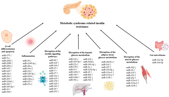 Effects of microRNAs on insulin resistance in MetS. (↓) shows that the expression of the relevant miRNA decreases, (↑) shows that the expression of the relevant miRNA increases.