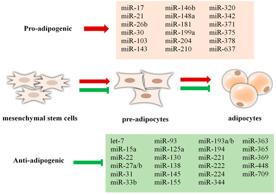 Some miRNAs that promote or inhibit adipogenesis weight increase. Red arrow indicates promote, green arrow indicates inhibit.