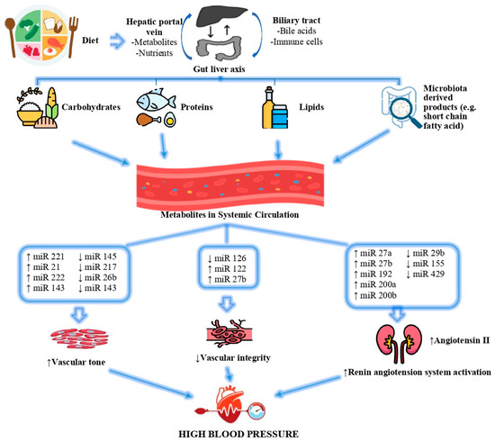 Environmental and genetic factors cause dysbiosis by inducing pathogenic bacteria to multiply and disrupt the intestinal microbiota. It is suggested that the changing microbiome composition with intestinal dysbiosis affects the pathogenesis of essential hypertension [214]. miRNA expression may be impacted downstream by dietary disruptions in the gut–liver axis, as evidenced by the study of nutritional epigenetics. Both macronutrients and micronutrients have been reported to influence regulatory miRNAs, thereby altering multiple cellular processes that contribute to hypertension and its comorbidities [215]. The effects of altered miRNA expressions in response to diet on the development of high blood pressure are shown in Figure 4.