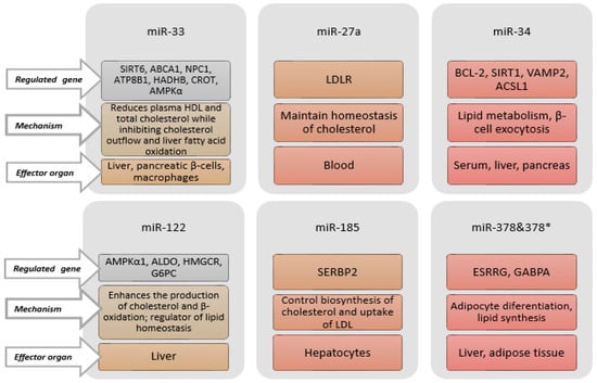 - Najafi-Shoushtari, S.H.; Kristo, F.; Li, Y.; Shioda, T.; Cohen, D.E.; Gerszten, R.E.; Näär, A.M. MicroRNA-33 and the SREBP host genes cooperate to control cholesterol homeostasis. Science 2010, 328, 1566–1569. [Google Scholar] [CrossRef]