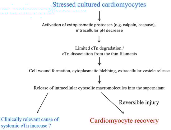 There is evidence from in vitro experimental models, that macromolecules, including cTn, are released in the absence of histological evidence of cardiomyocyte necrosis [26,41,42,43,44,45]. For example, cytoplasmic blebbing may already occur during the reversible phase of cell injury [26]. These blebs contain intracellular macromolecules and detach with resealing of the plasma membrane without cell death in cell culture experiments. This may therefore be responsible for limited cTn release from cardiomyocytes [26,41]. Furthermore, it has been reported in cell culture experiments, that tachycardia may stimulate integrins, thereby triggering the release of cTnI in the absence of necrosis [42]. Additionally, the cTn content of cardiomyocytes decreases prior to necrosis [46].