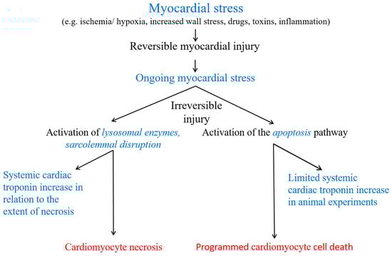 Cell death is preceded by a substantial reversible pre-lethal phase (see Figure 1) [26]. However, ongoing myocardial stress, depending on the mechanism and extent of myocardial stress, may lead to different forms of cell death (see Figure 2). When myocardial necrosis occurs, lysosomal enzymes degrade the contractile filaments, and the integrity of the plasmalemma is disrupted. Cardiomyocytes rapidly release intracellular macromolecules into the interstitial space. cTn shows a rapid increase after myocardial injury, comparably fast to cytosolic proteins [19,20,31,32,33,34]. There, additional proteolysis of troponins may occur, e.g., by matrix metalloproteinase-2 or thrombin [35,36]. Notably, however, the currently commercially available routine hs-cTnT assay, which utilizes antibodies targeting the amino acid fragment 125–147, is unaffected by thrombin-mediated cTnT degradation [37]. Local blood and lymphatic flow also influence the onset of the subsequent cTn increase in the systemic circulation. For example, early reperfusion of the infarct-related coronary artery results in more rapid extraction and clearance of cTn from damaged myocardium [38,39,40].
