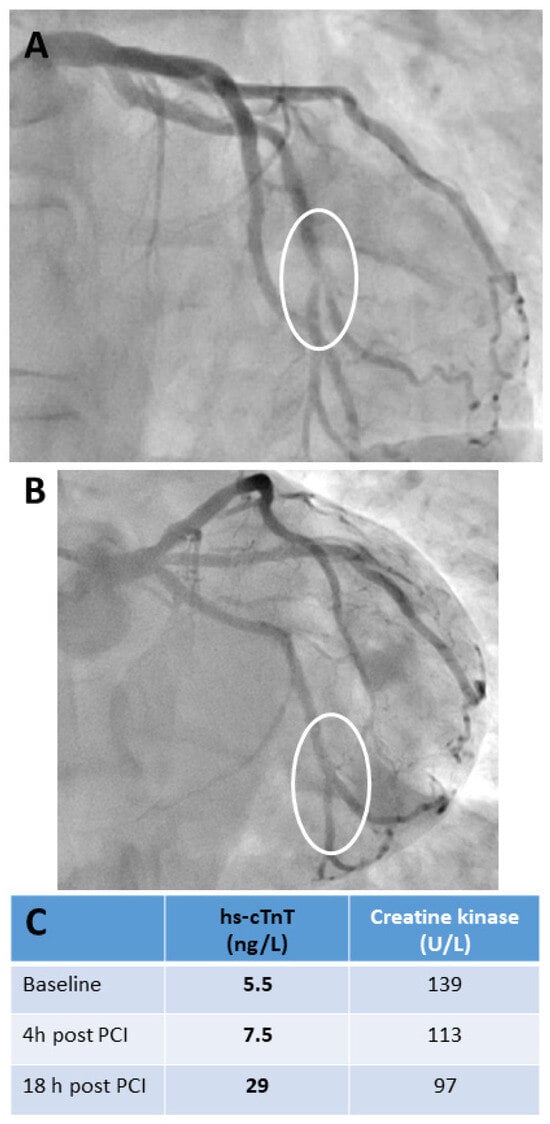 Cardiac biomarker release in a patient undergoing uncomplicated bifurcation percutaneous transluminal coronary intervention for unstable angina. This case clearly demonstrates the importance of specifying exactly when a proposed cTn decision limit should be used to diagnose peri-interventional AMI after elective PCI. A 55-year-old male with a history of CAD was admitted with symptoms of unstable angina. He underwent PCI of the left circumflex coronary artery 11 years ago. Serial ECGs before and after PCI showed no signs of acute myocardial ischemia. Serial hs-cTnT testing in the emergency department before PCI revealed concentrations within the normal range without a significant change. The criteria for AMI were not met. Urgent coronary angiography revealed a subtotal in-stent restenosis at the distal end of the stent involving the distal circumflex artery bifurcation (see (A), marked with a circle). There was no other significant stenosis. PCI was performed with an excellent primary result without any complications (see (B), marked with circle). The biomarker time courses are listed in (C). hs-cTnT showed no significant increase within 4 h after PCI, but increased significantly above the upper reference limit of 14 ng/L the following morning. Creatine kinase activities remained within the reference limit even showing a constant decline; the patient was a tunnel-building construction worker with physically demanding work. Abbreviations: high-sensitivity troponin T (hs-cTnT), percutaneous coronary intervention (PCI), circumflex artery (RCX), coronary artery disease (CAD), acute myocardial infarction (AMI).