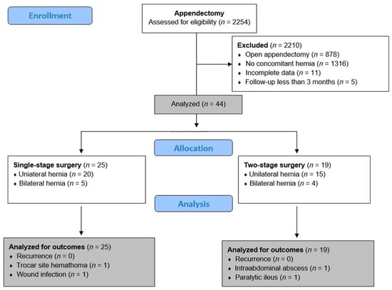For the purposes of this study, these patients were divided into two study groups based on the timing of hernia repair. The patients who underwent single-stage surgery (simultaneous laparoscopic appendectomy and hernia repair) were assigned to group I (n = 25), while the patients who underwent delayed laparoscopic hernia repair were assigned to group II (n = 19). Moreover, the patients were subdivided into subgroups depending on appendicitis severity (simple or complicated appendicitis). The decision to perform single-stage or two-stage surgery was based on the surgeon’s clinical judgment. The flow chart of the study is shown in Figure 1.