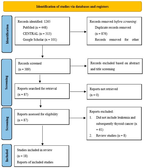 Our literature search yielded 1265 articles, among which 876 were duplicates and thus were excluded from the study. This led to 389 abstracts being screened. After the abstract screening, 302 articles were considered irrelevant to the topic of study and were thus excluded from the study, and the remaining 87 articles were searched for the retrieval of the full text and an assessment for eligibility for our review. After the eligibility assessment, 18 articles were included in the review, and 69 were excluded. The following were the reasons for excluding these 69 studies: 8 were secondary studies, 51 did not report the incidence of thyroid cancer as a second malignancy of leukemia, and 10 were duplicate reports from the same cohort of patients, including the Childhood Cancer Survivor study and the SEER (Surveillance, Epidemiology, and End Results) database. A PRISMA diagram summarizing the search strategy followed is presented in Figure 1.