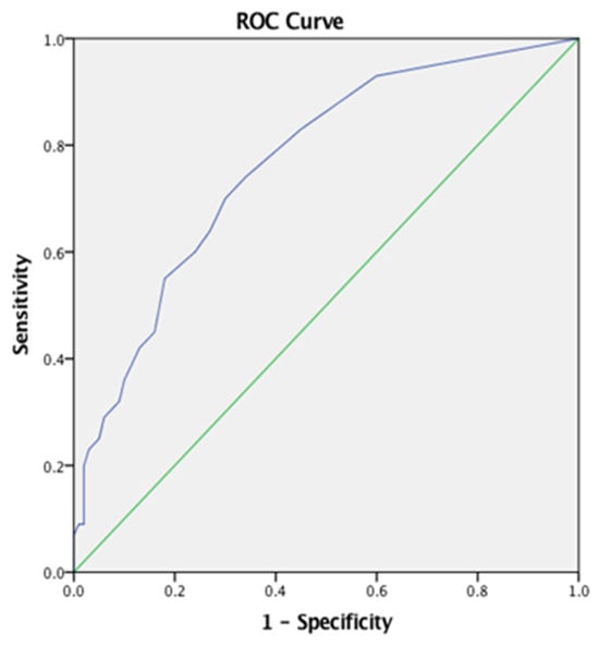 The ROC analyses showed that the DT-P total score had a strong discrimination capacity with an area under the curve (AUC) of 0.765 [SE = 0.033, 95% (0.70, 0.83), p < 0.01], with the optimal cut-off point equal to four <4> (sensitivity = 0.70 and 1-specificity = 0.30) between the parent/caregiver groups with and without feeding and/or swallowing disorders, as shown in Figure 1.