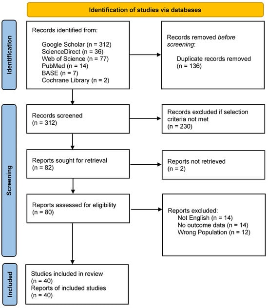 A total of 448 records were identified through systematic database searches. After removing 136 duplicates, 312 records remained for title and abstract screening. Of these, 230 were excluded for not meeting the eligibility criteria. The full texts of the remaining 80 reports were assessed for eligibility, resulting in the inclusion of 40 studies in the final systematic review. The flow chart of data selection is shown in Figure 1.