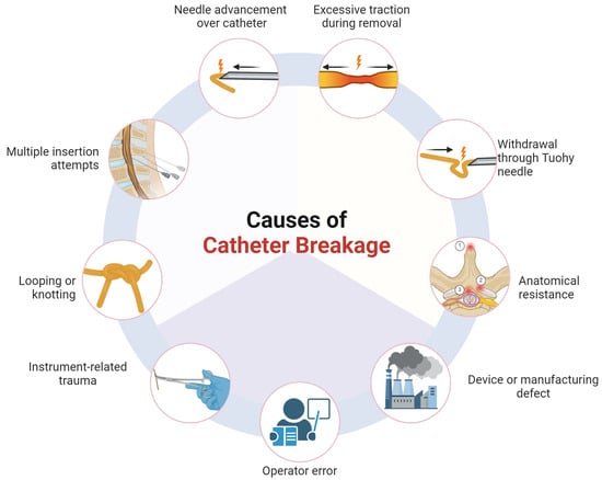 In total, 43 instances of catheter fragmentation were described. The most prevalent was mechanical stress during removal, accounting for 17 cases (39.5%), and included removal against resistance (n = 5, 11.6%), withdrawal through the Tuohy needle (n = 5, 11.6%), simultaneous extraction of the catheter and needle (n = 3, 7.0%), and excessive traction (n = 4, 9.3%). Technical errors during insertion or handling were identified in ten cases (23.3%), involving multiple insertion attempts or redirections (n = 3, 7.0%), excessive looping or manipulation (n = 5, 11.6%), and improper handling during placement (n = 2, 4.7%).